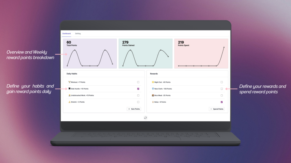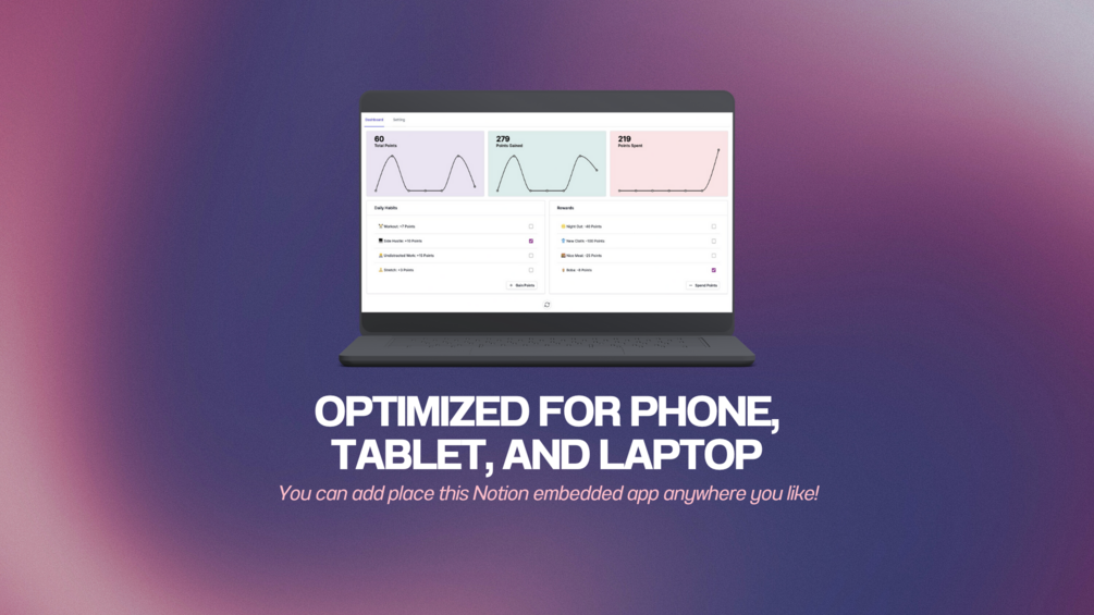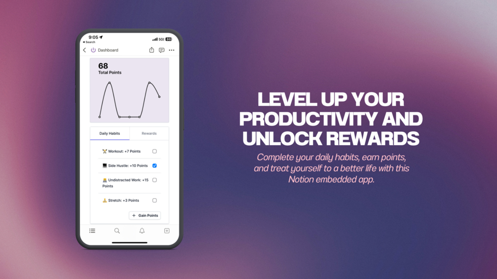 This Notion embedded app empowers you to effortlessly track your habits, earn reward points, and shape a more fulfilling life.