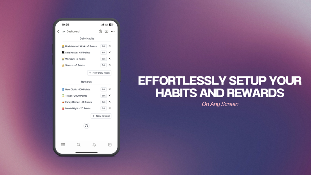Personalized Rewards: Attach point values to your habits and rewards. Achieve consistency, and redeem your hard-earned points for treats that bring you joy, whether it's a guilt-free snack or a movie night.